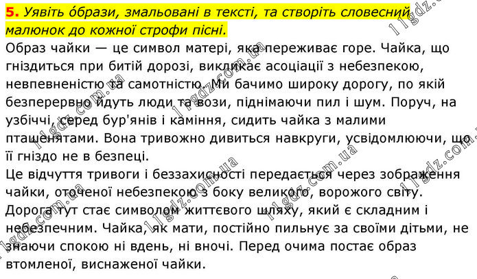 Уявіть о́брази, змальовані в тексті, та створіть словесний малюнок до кожної строфи пісні. Образ чайки — це символ матері, яка переживає горе. Чайка, що гніздиться при битій дорозі, викликає асоціації з небезпекою, невпевненістю та самотністю. Ми бачимо широку дорогу, по якій безперервно йдуть люди та вози, піднімаючи пил і шум. Поруч, на узбіччі, серед бур'янів і каміння, сидить чайка з малими пташенятами. Вона тривожно дивиться навкруги, усвідомлюючи, що її гніздо не в безпеці. Це відчуття тривоги і беззахисності передається через зображення чайки, оточеної небезпекою з боку великого, ворожого світу. Дорога тут стає символом життєвого шляху, який є складним і небезпечним. Чайка, як мати, постійно пильнує за своїми дітьми, не знаючи спокою ні вдень, ні вночі. Перед очима постає образ втомленої, виснаженої чайки.