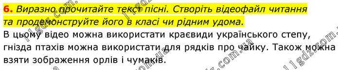 Виразно прочитайте текст пісні. Створіть відеофайл читання та продемонструйте його в класі чи рідним удома. В цьому відео можна використати краєвиди українського степу, гнізда птахів можна використати для рядків про чайку. Також можна взяти зображення орлів і чумаків.
