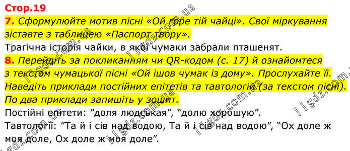 7. Сформулюйте мотив пісні «Ой горе тій чайці». Свої міркування зіставте з таблицею «Паспорт твору». Трагічна історія чайки, в якої чумаки забрали пташенят. 8. Перейдіть за покликанням чи QR-кодом (с. 17) й ознайомтеся з текстом чумацької пісні «Ой ішов чумак із дому». Прослухайте її. Наведіть приклади постійних епітетів та тавтологій (за текстом пісні). По два приклади запишіть у зошит. Постійні епітети: ”доля людськая”, “долю хорошую”. Тавтології: ”Та й і сів над водою, Та й і сів над водою”, “Ох доле ж моя доле, Ох доле ж моя доле”.