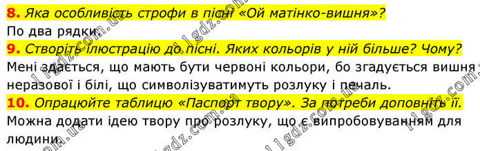 8. Яка особливість строфи в пісні «Ой матінко-вишня»? По два рядки. 9. Створіть ілюстрацію до пісні. Яких кольорів у ній більше? Чому? Мені здається, що мають бути червоні кольори, бо згадується вишня неразової і білі, що символізуватимуть розлуку і печаль. 10. Опрацюйте таблицю «Паспорт твору». За потреби доповніть її. Можна додати ідею твору про розлуку, що є випробовуванням для людини.