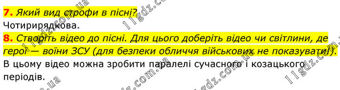 7. Який вид строфи в пісні? Чотирирядкова. 8. Створіть відео до пісні. Для цього доберіть відео чи світлини, де герої — воїни ЗСУ (для безпеки обличчя військових не показувати!). В цьому відео можна зробити паралелі сучасного і козацького періодів.