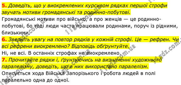 5. Доведіть, що у виокремлених курсивом рядках першої строфи звучать мотиви громадянські та родинно-побутові. Громадянські мотиви про військо, а про женців — це родинно-побутові, бо тоді люди часто працювали родинами, поруч із рідними, близькими. 6. Зверніть увагу на повтор рядків у кожній строфі. Це — рефрен. Чи всі рефрени виокремлено? Відповідь обґрунтуйте. Ні, не всі. В останніх строфах не виокремлено. 7. Прочитайте рядки і, ґрунтуючись на визначенні художнього паралелізму, доведіть, що в них використано паралелізм. Описується хода Війська Запорізького і робота людей в полі паралельно одна до одної.