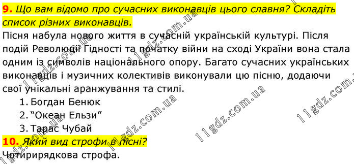 9. Що вам відомо про сучасних виконавців цього славня? Складіть список різних виконавців. Пісня набула нового життя в сучасній українській культурі. Після подій Революції Гідності та початку війни на сході України вона стала одним із символів національного опору. Багато сучасних українських виконавців і музичних колективів виконували цю пісню, додаючи свої унікальні аранжування та стилі. 1. Богдан Бенюк 2. “Океан Ельзи” 3. Тарас Чубай 10. Який вид строфи в пісні? Чотирирядкова строфа.