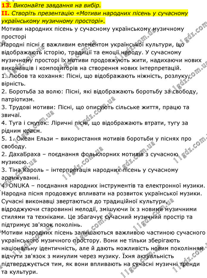Виконайте завдання на вибір. ІІ. Створіть презентацію «Мотиви народних пісень у сучасному українському музичному просторі». Мотиви народних пісень у сучасному українському музичному просторі Народні пісні є важливим елементом української культури, що відображають історію, традиції та емоції народу. У сучасному музичному просторі їх мотиви продовжують жити, надихаючи нових виконавців і композиторів на створення нових інтерпретацій. 1. Любов та кохання: Пісні, що відображають ніжність, розлуку, вірність. 2. Боротьба за волю: Пісні, які відображають боротьбу за свободу, патріотизм. 3. Трудові мотиви: Пісні, що описують сільське життя, працю та звичаї. 4. Туга і смуток: Ліричні пісні, що відображають втрати, тугу за рідним краєм. 5. 1. Океан Ельзи – використання мотивів боротьби у піснях про свободу. 2. ДахаБраха – поєднання фольклорних мотивів з сучасною музикою. 3. Тіна Кароль – інтерпретація народних пісень у сучасному аранжуванні. 4. ONUKA – поєднання народних інструментів та електронної музики. Народна пісня продовжує впливати на розвиток української музики. Сучасні виконавці звертаються до традиційної культури, відроджуючи старовинні мелодії, змішуючи їх з новими музичними стилями та техніками. Це збагачує сучасний музичний простір та підтримує зв'язок поколінь. Мотиви народних пісень залишаються важливою частиною сучасного українського музичного простору. Вони не тільки зберігають національну ідентичність, але й дають можливість новим поколінням відчути зв'язок з минулим через музику. Їхня актуальність підтверджується тим, як вони впливають на сучасні музичні тренди та культури.