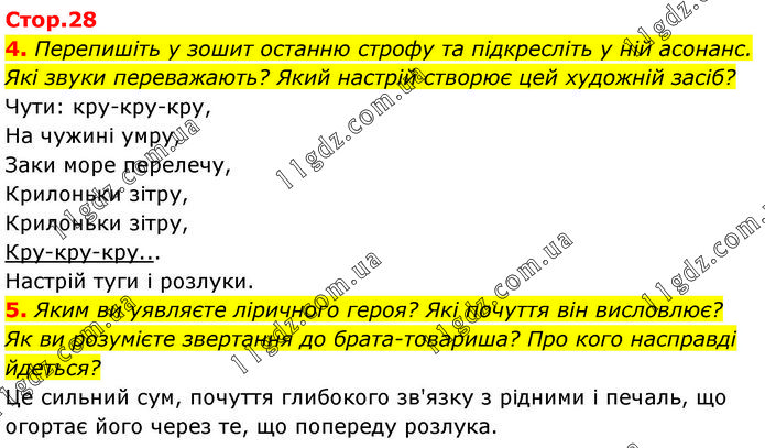 4. Перепишіть у зошит останню строфу та підкресліть у ній асонанс. Які звуки переважають? Який настрій створює цей художній засіб? Чути: кру-кру-кру, На чужині умру, Заки море перелечу, Крилоньки зітру, Крилоньки зітру, Кру-кру-кру... Настрій туги і розлуки. 5. Яким ви уявляєте ліричного героя? Які почуття він висловлює? Як ви розумієте звертання до брата-товариша? Про кого насправді йдеться? Це сильний сум, почуття глибокого зв'язку з рідними і печаль, що огортає його через те, що попереду розлука.