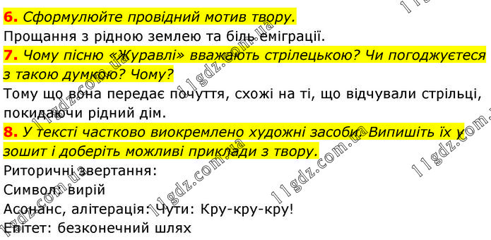 6. Сформулюйте провідний мотив твору. Прощання з рідною землею та біль еміграції. 7. Чому пісню «Журавлі» вважають стрілецькою? Чи погоджуєтеся з такою думкою? Чому? Тому що вона передає почуття, схожі на ті, що відчували стрільці, покидаючи рідний дім. 8. У тексті частково виокремлено художні засоби. Випишіть їх у зошит і доберіть можливі приклади з твору. Риторичні звертання: Символ: вирій Асонанс, алітерація: Чути: Кру-кру-кру! Епітет: безконечний шлях