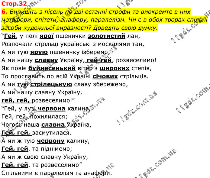 Випишіть з пісень по дві останні строфи та виокремте в них метафори, епітети, анафору, паралелізм. Чи є в обох творах спільні засоби художньої виразності? Доведіть свою думку. “Гей, у полі ярої пшенички золотистий лан, Розпочали стрільці українські з москалями тан, А ми тую ярую пшеничку ізберемо, А ми нашу славну Україну, гей-гей, розвеселимо! Як повіє буйнесенький вітер з широких степів, То прославить по всій Україні січових стрільців. А ми тую стрілецькую славу збережемо, А ми нашу славну Україну, гей, гей, розвеселимо!” “Гей, у лузі червона калина, Гей, гей, похилилася; Чогось наша славна Україна, Гей, гей, засмутилася. А ми ж тую червону калину, Гей, гей, та піднімемо; А ми ж свою славну Україну, Гей, гей, та розвеселимо” Спільними є паралелізм та анафори.