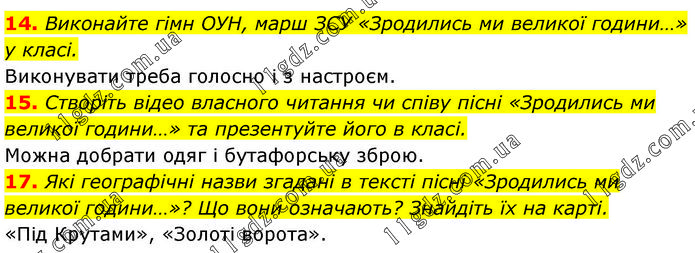 14. Виконайте гімн ОУН, марш ЗСУ «Зродились ми великої години…» у класі. Виконувати треба голосно і з настроєм. 15. Створіть відео власного читання чи співу пісні «Зродились ми великої години…» та презентуйте його в класі. Можна добрати одяг і бутафорську зброю. 17. Які географічні назви згадані в тексті пісні «Зродились ми великої години…»? Що вони означають? Знайдіть їх на карті. «Під Крутами», «Золоті ворота».