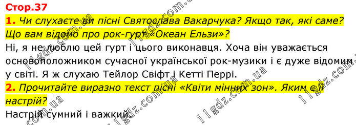 1. Чи слухаєте ви пісні Святослава Вакарчука? Якщо так, які саме? Що вам відомо про рок-гурт «Океан Ельзи»? Ні, я не люблю цей гурт і цього виконавця. Хоча він уважається основоположником сучасної української рок-музики і є дуже відомим у світі. Я ж слухаю Тейлор Свіфт і Кетті Перрі. 2. Прочитайте виразно текст пісні «Квіти мінних зон». Яким є її настрій? Настрій сумний і важкий.