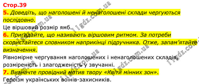 5. Доведіть, що наголошені й ненаголошені склади чергуються послідовно. Це віршовий розмір ямб. 6. Пригадайте, що називають віршовим ритмом. За потреби скористайтеся словником наприкінці підручника. Отже, запам’ятайте визначення. Рівномірне чергування наголошених і ненаголошених складів, розміреність і злагодженість у звучанні. 7. Визначте провідний мотив твору «Квіти мінних зон». Героїзм українських воїнів-захисників.
