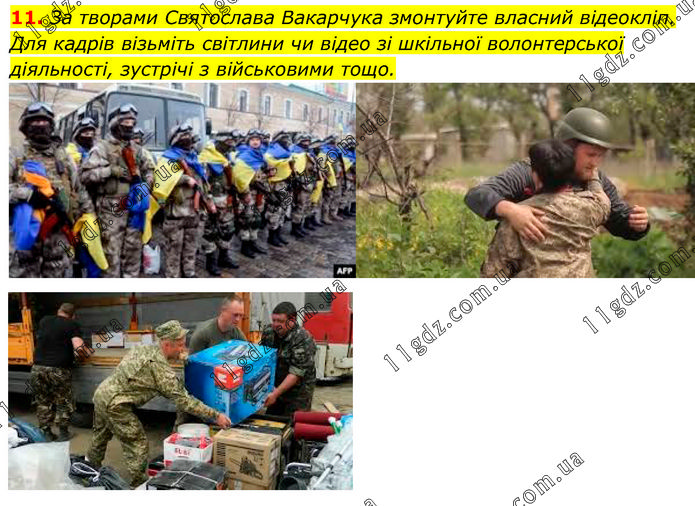 За творами Святослава Вакарчука змонтуйте власний відеокліп. Для кадрів візьміть світлини чи відео зі шкільної волонтерської діяльності, зустрічі з військовими тощо.