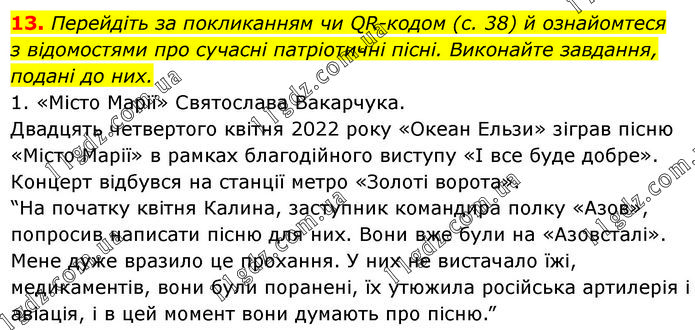Перейдіть за покликанням чи QR-кодом (с. 38) й ознайомтеся з відомостями про сучасні патріотичні пісні. Виконайте завдання, подані до них. 1. «Місто Марії» Святослава Вакарчука. Двадцять четвертого квітня 2022 року «Океан Ельзи» зіграв пісню «Місто Марії» в рамках благодійного виступу «І все буде добре». Концерт відбувся на станції метро «Золоті ворота». “На початку квітня Калина, заступник командира полку «Азов», попросив написати пісню для них. Вони вже були на «Азовсталі». Мене дуже вразило це прохання. У них не вистачало їжі, медикаментів, вони були поранені, їх утюжила російська артилерія і авіація, і в цей момент вони думають про пісню.”