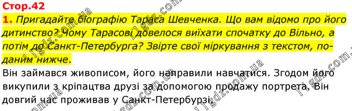 Пригадайте біографію Тараса Шевченка. Що вам відомо про його дитинство? Чому Тарасові довелося виїхати спочатку до Вільно, а потім до Санкт-Петербурга? Звірте свої міркування з текстом, по-даним нижче. Він займався живописом, його направили навчатися. Згодом його викупили з кріпацтва друзі за допомогою продажу портрета. Він довгий час проживав у Санкт-Петербурзі.
