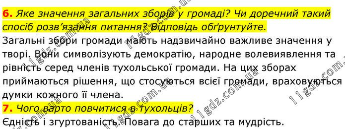 6. Яке значення загальних зборів у громаді? Чи доречний такий спосіб розв’язання питання? Відповідь обґрунтуйте. Загальні збори громади мають надзвичайно важливе значення у творі. Вони символізують демократію, народне волевиявлення та рівність серед членів тухольської громади. На цих зборах приймаються рішення, що стосуються всієї громади, враховуються думки кожного її члена. 7. Чого варто повчитися в тухольців? Єдність і згуртованість. Повага до старших та мудрість.