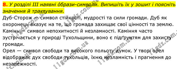 У розділі ІІІ наявні о́брази-символи. Випишіть їх у зошит і поясніть значення й трактування. Дуб-Сторож — символ стійкості, мудрості та сили громади. Дуб як охоронець вказує на те, що громада захищає свої цінності та землю. Камінь — символ непохитності й незламності. Каміння часто зустрічається у природі Тухольщини, воно є підґрунтям для захисту громади. Орел — символ свободи та високого польоту думок. У творі орел відображає дух свободи тухольців, їхню незламність і прагнення до незалежності.