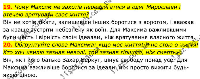 19. Чому Максим не захотів перевдягатися в одяг Мирослави і втечею врятувати своє життя? Він не хотів тікати, залишивши інших боротися з ворогом, і вважав за краще зустріти небезпеку як воїн. Для Максима важливішими були честь і вірність своїм ідеалам, ніж врятування власного життя. 20. Обґрунтуйте слова Максима: «Що моє життя! Я не стою о життя! Хто хоч хвилю зазнав неволі, той зазнав гіршого, ніж смерть». Він, як і його батько Захар Беркут, цінує свободу понад усе. Для Максима важливіше боротися за ідеали, ніж просто вижити будь-якою ціною.