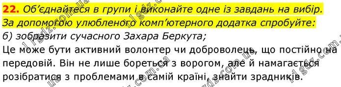 Об’єднайтеся в групи і виконайте одне із завдань на вибір. За допомогою улюбленого комп’ютерного додатка спробуйте: б) зобразити сучасного Захара Беркута; Це може бути активний волонтер чи доброволець, що постійно на передовій. Він не лише бореться з ворогом, але й намагається розібратися з проблемами в самій країні, знайти зрадників.
