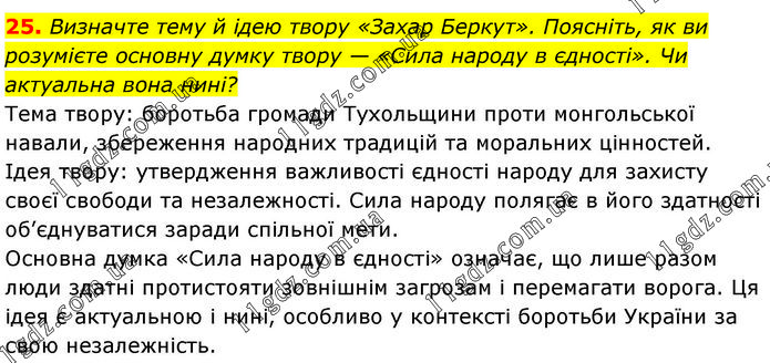 Визначте тему й ідею твору «Захар Беркут». Поясніть, як ви розумієте основну думку твору — «Сила народу в єдності». Чи актуальна вона нині? Тема твору: боротьба громади Тухольщини проти монгольської навали, збереження народних традицій та моральних цінностей. Ідея твору: утвердження важливості єдності народу для захисту своєї свободи та незалежності. Сила народу полягає в його здатності об’єднуватися заради спільної мети. Основна думка «Сила народу в єдності» означає, що лише разом люди здатні протистояти зовнішнім загрозам і перемагати ворога. Ця ідея є актуальною і нині, особливо у контексті боротьби України за свою незалежність.