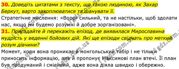 30. Доведіть цитатами з тексту, що такою людиною, як Захар Беркут, варто захоплюватися та шанувати її. Стратегічне мислення: «Ворог сильний, та не настільки, щоб здолати нас, якщо ми будемо розумні й добре зорганізовані». 31. Пригадайте й перекажіть епізод, де виявилася Мирославина мудрість у веденні бойових дій. Які ще епізоди свідчать про меткий розум дівчини? Момент, коли вона проникає в монгольський табір і не тільки приносить інформацію, але й пропонує Максимові план втечі. Її план був продуманий і сміливий, адже вона діяла швидко і обережно.