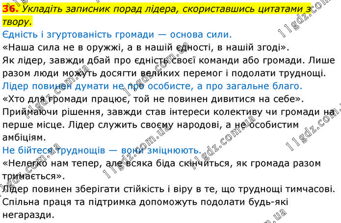 36. Укладіть записник порад лідера, скориставшись цитатами з твору. Єдність і згуртованість громади — основа сили. «Наша сила не в оружжі, а в нашій єдності, в нашій згоді». Як лідер, завжди дбай про єдність своєї команди або громади. Лише разом люди можуть досягти великих перемог і подолати труднощі. Лідер повинен думати не про особисте, а про загальне благо. «Хто для громади працює, той не повинен дивитися на себе». Приймаючи рішення, завжди став інтереси колективу чи громади на перше місце. Лідер служить своєму народові, а не особистим амбіціям. Не бійтеся труднощів — вони зміцнюють. «Нелегко нам тепер, але всяка біда скінчиться, як громада разом тримається». Лідер повинен зберігати стійкість і віру в те, що труднощі тимчасові. Спільна праця та підтримка допоможуть подолати будь-які негаразди.