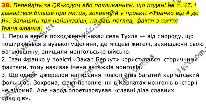 Перейдіть за QR-кодом або покликанням, що подані на с. 47, і дізнайтеся більше про митця, зокрема й у проєкті «Франко від А до Я». Запишіть три найцікавіші, на ваш погляд, факти з життя Івана Франка. 1. Перша версія походження назви села Тухля — від смороду, що поширювався з вузької ущелини, де місцеві жителі, захищаючи свою Батьківщину, знищили монгольське військо. 2. Іван Франко у повісті «Захар Беркут» користувався історичними фактами, тому називає імена ватажків монголів. 3. Ще одним джерелом написання повісті став багатий карпатський фольклор. Зокрема, факт потоплення в Карпатах монголів в історії не відомий. Але народ опоетизовував «славні діла славних прадідів».