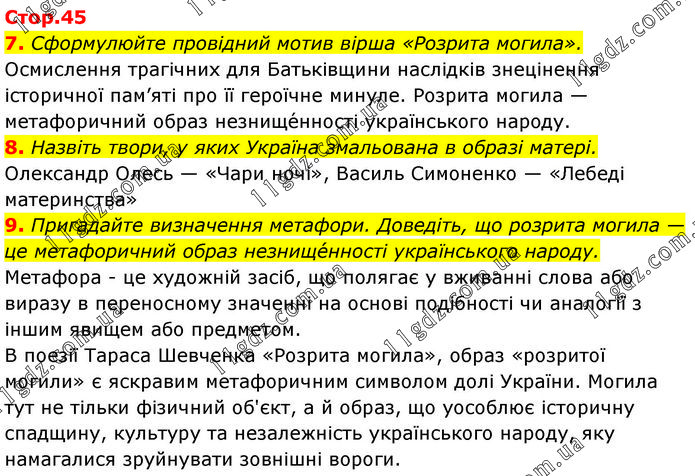 7. Сформулюйте провідний мотив вірша «Розрита могила». Осмислення трагічних для Батьківщини наслідків знецінення історичної пам’яті про її героїчне минуле. Розрита могила — метафоричний образ незнище́нності українського народу. 8. Назвіть твори, у яких Україна змальована в образі матері. Олександр Олесь — «Чари ночі», Василь Симоненко — «Лебеді материнства» 9. Пригадайте визначення метафори. Доведіть, що розрита могила — це метафоричний образ незнище́нності українського народу. Метафора - це художній засіб, що полягає у вживанні слова або виразу в переносному значенні на основі подібності чи аналогії з іншим явищем або предметом. В поезії Тараса Шевченка «Розрита могила», образ «розритої могили» є яскравим метафоричним символом долі України. Могила тут не тільки фізичний об'єкт, а й образ, що уособлює історичну спадщину, культуру та незалежність українського народу, яку намагалися зруйнувати зовнішні вороги.