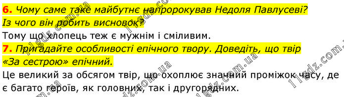6. Чому саме таке майбутнє напророкував Недоля Павлусеві? Із чого він робить висновок? Тому що хлопець теж є мужнім і сміливим. 7. Пригадайте особливості епічного твору. Доведіть, що твір «За сестрою» епічний. Це великий за обсягом твір, що охоплює значний проміжок часу, де є багато героїв, як головних, так і другорядних.