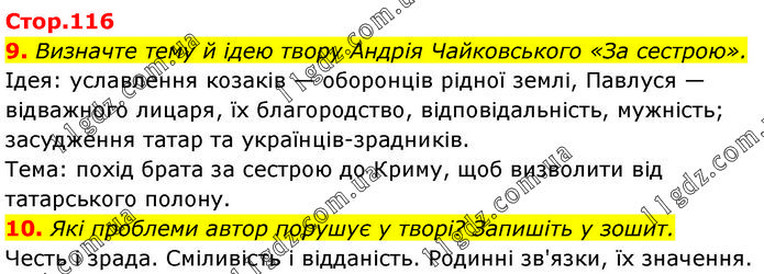 9. Визначте тему й ідею твору Андрія Чайковського «За сестрою». Ідея: уславлення козаків — оборонців рідної землі, Павлуся — відважного лицаря, їх благородство, відповідальність, мужність; засудження татар та українців-зрадників. Тема: похід брата за сестрою до Криму, щоб визволити від татарського полону. 10. Які проблеми автор порушує у творі? Запишіть у зошит. Честь і зрада. Сміливість і відданість. Родинні зв'язки, їх значення.