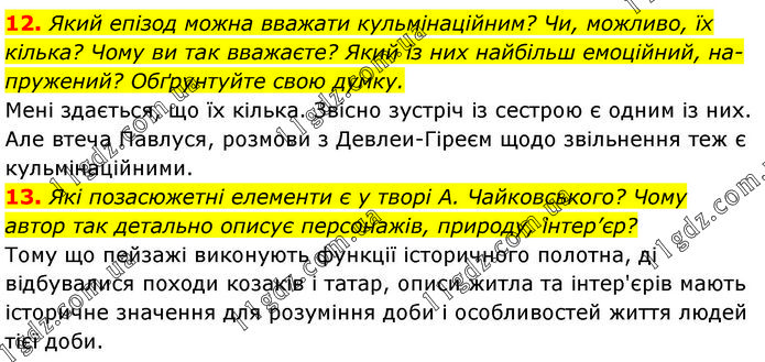 12. Який епізод можна вважати кульмінаційним? Чи, можливо, їх кілька? Чому ви так вважаєте? Який із них найбільш емоційний, на- пружений? Обґрунтуйте свою думку. Мені здається, що їх кілька. Звісно зустріч із сестрою є одним із них. Але втеча Павлуся, розмови з Девлеи-Гіреєм щодо звільнення теж є кульмінаційними. 13. Які позасюжетні елементи є у творі А. Чайковського? Чому автор так детально описує персонажів, природу, інтер’єр? Тому що пейзажі виконують функції історичного полотна, ді відбувалися походи козаків і татар, описи житла та інтер'єрів мають історичне значення для розуміння доби і особливостей життя людей тієї доби.
