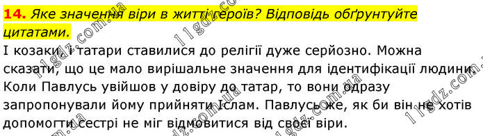 Яке значення віри в житті героїв? Відповідь обґрунтуйте цитатами. І козаки, і татари ставилися до релігії дуже серйозно. Можна сказати, що це мало вирішальне значення для ідентифікації людини. Коли Павлусь увійшов у довіру до татар, то вони одразу запропонували йому прийняти Іслам. Павлусь же, як би він не хотів допомогти сестрі не міг відмовитися від своєї віри.