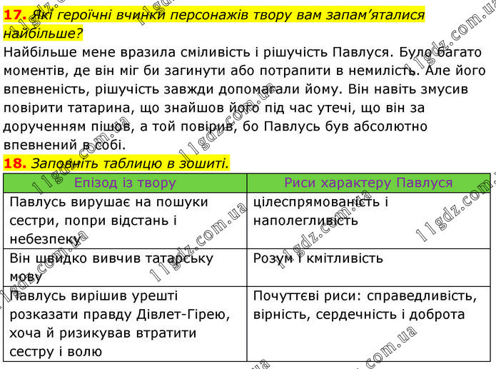 17. Які героїчні вчинки персонажів твору вам запам’яталися найбільше? Найбільше мене вразила сміливість і рішучість Павлуся. Було багато моментів, де він міг би загинути або потрапити в немилість. Але його впевненість, рішучість завжди допомагали йому. Він навіть змусив повірити татарина, що знайшов його під час утечі, що він за дорученням пішов, а той повірив, бо Павлусь був абсолютно впевнений в собі. 18. Заповніть таблицю в зошиті.