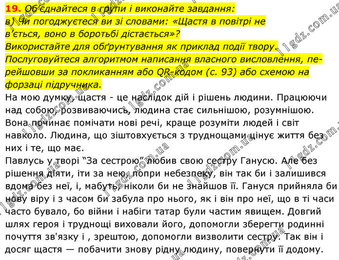 Об’єднайтеся в групи і виконайте завдання: в) Чи погоджуєтеся ви зі словами: «Щастя в повітрі не в’ється, воно в боротьбі дістається»? Використайте для обґрунтування як приклад події твору. Послуговуйтеся алгоритмом написання власного висловлення, пе- рейшовши за покликанням або QR-кодом (с. 93) або схемою на форзаці підручника. На мою думку, щастя - це наслідок дій і рішень людини. Працюючи над собою, розвиваючись, людина стає сильнішою, розумнішою. Вона починає помічати нові речі, краще розуміти людей і світ навколо. Людина, що зіштовхується з труднощами цінує життя без них і те, що має. Павлусь у творі “За сестрою” любив свою сестру Ганусю. Але без рішення діяти, іти за нею, попри небезпеку, він так би і залишився вдома без неї, і, мабуть, ніколи би не знайшов її. Гануся прийняла би нову віру і з часом би забула про нього, як і він про неї, що в ті часи часто бувало, бо війни і набіги татар були частим явищем. Довгий шлях героя і труднощі виховали його, допомогли зберегти родинні почуття зв'язку і , зрештою, допомогли визволити сестру. Так він і досяг щастя — побачити знову рідну людину, повернути її додому.