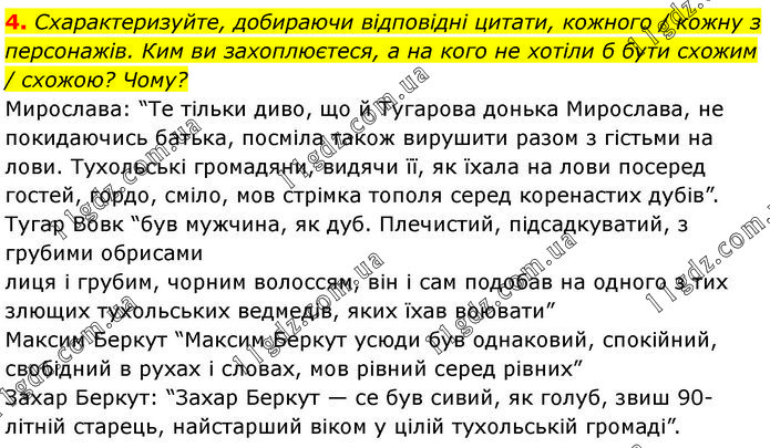 Схарактеризуйте, добираючи відповідні цитати, кожного / кожну з персонажів. Ким ви захоплюєтеся, а на кого не хотіли б бути схожим / схожою? Чому? Мирослава: “Те тільки диво, що й Тугарова донька Мирослава, не покидаючись батька, посміла також вирушити разом з гістьми на лови. Тухольські громадяни, видячи її, як їхала на лови посеред гостей, гордо, сміло, мов стрімка тополя серед коренастих дубів”. Тугар Вовк “був мужчина, як дуб. Плечистий, підсадкуватий, з грубими обрисами лиця і грубим, чорним волоссям, він і сам подобав на одного з тих злющих тухольських ведмедів, яких їхав воювати” Максим Беркут “Максим Беркут усюди був однаковий, спокійний, свобідний в рухах і словах, мов рівний серед рівних” Захар Беркут: “Захар Беркут — се був сивий, як голуб, звиш 90-літній старець, найстарший віком у цілій тухольській громаді”.