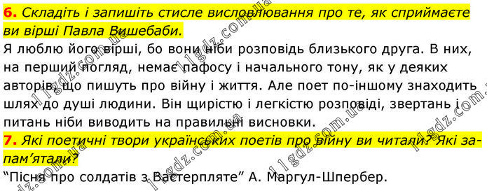 6. Складіть і запишіть стисле висловлювання про те, як сприймаєте ви вірші Павла Вишебаби. Я люблю його вірші, бо вони ніби розповідь близького друга. В них, на перший погляд, немає пафосу і начального тону, як у деяких авторів, що пишуть про війну і життя. Але поет по-іншому знаходить шлях до душі людини. Він щирістю і легкістю розповіді, звертань і питань ніби виводить на правильні висновки. 7. Які поетичні твори українських поетів про війну ви читали? Які за- пам’ятали? “Пісня про солдатів з Вастерпляте” А. Маргул-Шпербер.