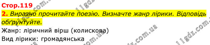 Виразно прочитайте поезію. Визначте жанр лірики. Відповідь обґрунтуйте. Жанр: ліричний вірш (колискова) Вид лірики: громадянська
