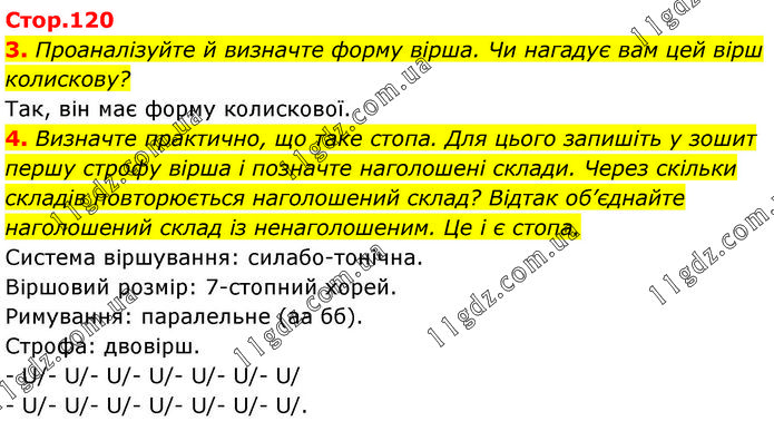 3. Проаналізуйте й визначте форму вірша. Чи нагадує вам цей вірш колискову? Так, він має форму колискової. 4. Визначте практично, що таке стопа. Для цього запишіть у зошит першу строфу вірша і позначте наголошені склади. Через скільки складів повторюється наголошений склад? Відтак об’єднайте наголошений склад із ненаголошеним. Це і є стопа. Система віршування: силабо-тонічна. Віршовий розмір: 7-стопний хорей. Римування: паралельне (аа бб). Строфа: двовірш. - U/- U/- U/- U/- U/- U/- U/ - U/- U/- U/- U/- U/- U/- U/.
