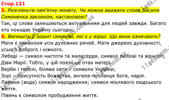 5. Розгляньте пам’ятну монету. Чи можна вважати слова Василя Симоненка закликом, настановою? Так, ці слова залишаються актуальними для людей завжди. Багато хто покидає Україну сьогодні. 6. Випишіть у зошит символи, які є у вірші. Що вони означають? Мати є символом усіх духовних речей. Мати джерело духовності, усього доброго і ніжного. Лебеді — символ чистоти та милосердя, символ любові та вірності, Діви Марії. Тобто, у цій поезії це птах матері. Верби і тополі, білява хата – символи України; Зорі – присутність божества, ангела-посланця Бога, надія. Лимани (вода) символ народження; символ мінливого людського життя. Півень є символом пробудження життя.