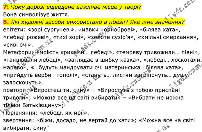 7. Чому дорозі відведене важливе місце у творі? Вона символізує життя. 8. Які художні засоби використано в поезії? Яке їхнє значення? епітети: «зорі сургучеві», «мавки чорноброві», «білява хата», «лебеді рожеві», «тихі зорі», «золоте сузір’я», «хмільні смеркання», «сиві очі». Метафори: «мріють криками… лебеді», «темряву тривожили… півні», «танцювали лебеді», «заглядає в шибку казка», «лебеді… лоскотали марево», «…будуть мандрувати очі материнська і білява хата», «прийдуть верби і тополі», «стануть… листям затріпочуть… душу залоскочуть». повтори: «Виростеш ти, сину» – «Виростуть з тобою приспані тривоги»; «Можна все на світі вибирати» – «Вибрати не можна тільки Батьківщину»; Порівняння: «лебеді, як мрії». звертання: «біжи, досадо, не вертай до хати»; «Можна все на світі вибирати, сину”