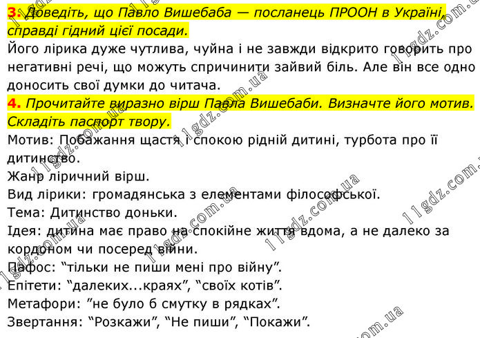 3. Доведіть, що Павло Вишебаба — посланець ПРООН в Україні, справді гідний цієї посади. Його лірика дуже чутлива, чуйна і не завжди відкрито говорить про негативні речі, що можуть спричинити зайвий біль. Але він все одно доносить свої думки до читача. 4. Прочитайте виразно вірш Павла Вишебаби. Визначте його мотив. Складіть паспорт твору. Мотив: Побажання щастя і спокою рідній дитині, турбота про її дитинство. Жанр ліричний вірш. Вид лірики: громадянська з елементами філософської. Тема: Дитинство доньки. Ідея: дитина має право на спокійне життя вдома, а не далеко за кордоном чи посеред війни. Пафос: “тільки не пиши мені про війну”. Епітети: “далеких...краях”, “своїх котів”. Метафори: ”не було б смутку в рядках”. Звертання: “Розкажи”, “Не пиши”, “Покажи”.