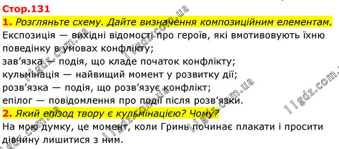 1. Розгляньте схему. Дайте визначення композиційним елементам. Експозиція — вихідні відомості про героїв, які вмотивовують їхню поведінку в умовах конфлікту; зав’язка — подія, що кладе початок конфлікту; кульмінація — найвищий момент у розвитку дії; розв’язка — подія, що розв’язує конфлікт; епілог — повідомлення про події після розв’язки. 2. Який епізод твору є кульмінацією? Чому? На мою думку, це момент, коли Гринь починає плакати і просити дівчину лишитися з ним.