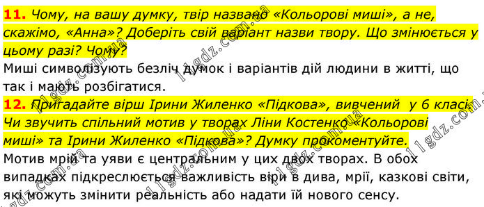 11. Чому, на вашу думку, твір названо «Кольорові миші», а не, скажімо, «Анна»? Доберіть свій варіант назви твору. Що змінюється у цьому разі? Чому? Миші символізують безліч думок і варіантів дій людини в житті, що так і мають розбігатися. 12. Пригадайте вірш Ірини Жиленко «Підкова», вивчений у 6 класі. Чи звучить спільний мотив у творах Ліни Костенко «Кольорові миші» та Ірини Жиленко «Підкова»? Думку прокоментуйте. Мотив мрій та уяви є центральним у цих двох творах. В обох випадках підкреслюється важливість віри в дива, мрії, казкові світи, які можуть змінити реальність або надати їй нового сенсу.