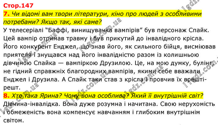 7. Чи відомі вам твори літератури, кіно про людей з особливими потребами? Якщо так, які саме? У телесеріалі “Баффі, винищувачка вампірів” був персонаж Спайк. Цей вампір отримав травму і був прикутий до інвалідного крісла. Його конкурент Енджел, що знав його, як сильного бійця, висміював приятеля і знущався над його інвалідністю разом із колишньою дівчиною Спайка — вампіркою Друзилою. Це, на мою думку, булінг, не гідний справжніх благородних вампірів, якими себе вважали Енджел і Друзила. А Спайк таки став з крісла і провчив їх врешті-решт. 8. Хто така Ярина? Чому вона особлива? Який її внутрішній світ? Дівчина-інвалідка. Вона дуже розумна і начитана. Свою нерухомість і обмеженість вона компенсує навчанням і глибоким внутрішнім світом.