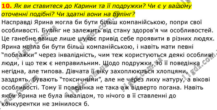 Як ви ставитеся до Карини та її подружки? Чи є у вашому оточенні подібні? Чи здатні вони на булінг? Насправді Ярина могла би бути більш компанійською, попри свої особливості. Булінг не залежить від стану здоров'я чи особливостей. Це ганебне явище лише шукає привід себе проявити в різних людях. Ярина могла би бути більш компанійською, і навіть мати певні “поблажки” через інвалідність, чим теж користуються деякі особливі люди, і що теж є неправильним. Щодо подружки, то її поведінка негідна, але типова. Дівчата її віку захоплюються хлопцями, заздрять, бувають “токсичними”, але не через лиху натуру, а вікові особливості. Тому її поведінка не така аж відверто погана. Навіть якби Ярина не була інвалідом, то нічого в її ставленні до конкурентки не змінилося б.