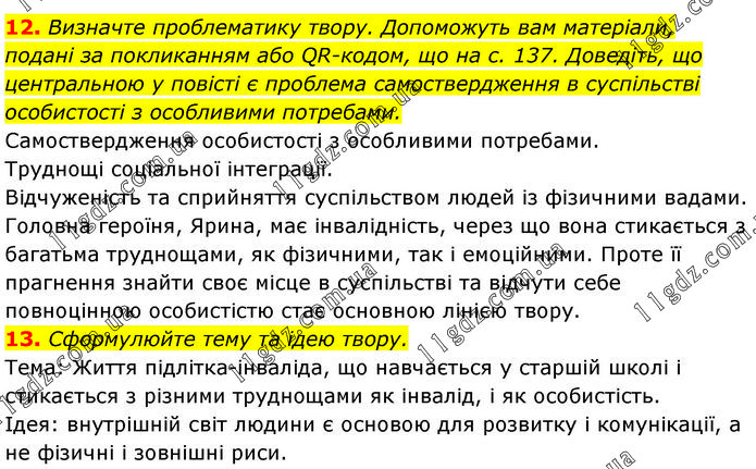 12. Визначте проблематику твору. Допоможуть вам матеріали, подані за покликанням або QR-кодом, що на с. 137. Доведіть, що центральною у повісті є проблема самоствердження в суспільстві особистості з особливими потребами. Самоствердження особистості з особливими потребами. Труднощі соціальної інтеграції. Відчуженість та сприйняття суспільством людей із фізичними вадами. Головна героїня, Ярина, має інвалідність, через що вона стикається з багатьма труднощами, як фізичними, так і емоційними. Проте її прагнення знайти своє місце в суспільстві та відчути себе повноцінною особистістю стає основною лінією твору. 13. Сформулюйте тему та ідею твору. Тема: Життя підлітка-інваліда, що навчається у старшій школі і стикається з різними труднощами як інвалід, і як особистість. Ідея: внутрішній світ людини є основою для розвитку і комунікації, а не фізичні і зовнішні риси.