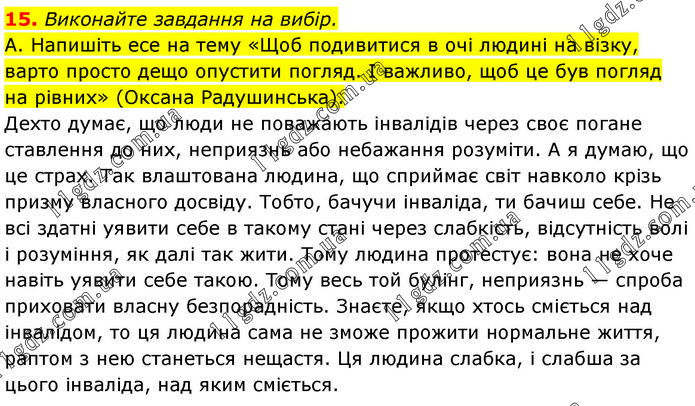 Виконайте завдання на вибір. А. Напишіть есе на тему «Щоб подивитися в очі людині на візку, варто просто дещо опустити погляд. І важливо, щоб це був погляд на рівних» (Оксана Радушинська). Дехто думає, що люди не поважають інвалідів через своє погане ставлення до них, неприязнь або небажання розуміти. А я думаю, що це страх. Так влаштована людина, що сприймає світ навколо крізь призму власного досвіду. Тобто, бачучи інваліда, ти бачиш себе. Не всі здатні уявити себе в такому стані через слабкість, відсутність волі і розуміння, як далі так жити. Тому людина протестує: вона не хоче навіть уявити себе такою. Тому весь той булінг, неприязнь — спроба приховати власну безпорадність. Знаєте, якщо хтось сміється над інвалідом, то ця людина сама не зможе прожити нормальне життя, раптом з нею станеться нещастя. Ця людина слабка, і слабша за цього інваліда, над яким сміється.