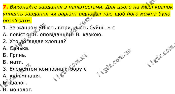 Виконайте завдання з напівтестами. Для цього на місці крапок упишіть завдання чи варіант відповіді так, щоб його можна було розв’язати. 1. За жанром «Віють вітри, віють буйні…» є А. повістю. Б. оповіданням. В. казкою. 2. Хто доглядає хлопця? А. Санька. Б. Гринь. В. мати. 3. Елементом композиції твору є А. кульмінація. Б. діалог. В. монолог.