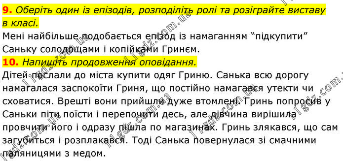9. Оберіть один із епізодів, розподіліть ролі та розіграйте виставу в класі. Мені найбільше подобається епізод із намаганням “підкупити” Саньку солодощами і копійками Гринєм. 10. Напишіть продовження оповідання. Дітей послали до міста купити одяг Гриню. Санька всю дорогу намагалася заспокоїти Гриня, що постійно намагався утекти чи сховатися. Врешті вони прийшли дуже втомлені. Гринь попросив у Саньки піти поїсти і перепочити десь, але дівчина вирішила провчити його і одразу пішла по магазинах. Гринь злякався, що сам загубиться і розплакався. Тоді Санька повернулася зі смачними паляницями з медом.