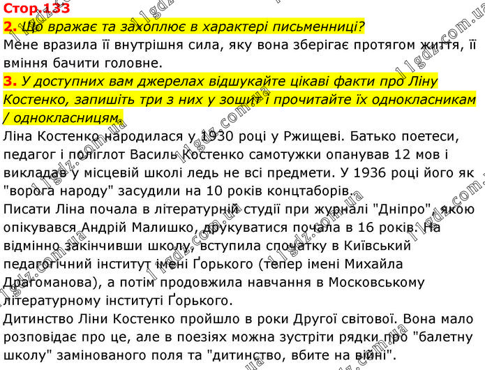 2. Що вражає та захоплює в характері письменниці? Мене вразила її внутрішня сила, яку вона зберігає протягом життя, її вміння бачити головне. 3. У доступних вам джерелах відшукайте цікаві факти про Ліну Костенко, запишіть три з них у зошит і прочитайте їх однокласникам / однокласницям. Ліна Костенко народилася у 1930 році у Ржищеві. Батько поетеси, педагог і поліглот Василь Костенко самотужки опанував 12 мов і викладав у місцевій школі ледь не всі предмети. У 1936 році його як "ворога народу" засудили на 10 років концтаборів. Писати Ліна почала в літературній студії при журналі "Дніпро", якою опікувався Андрій Малишко, друкуватися почала в 16 років. На відмінно закінчивши школу, вступила спочатку в Київський педагогічний інститут імені Ґорького (тепер імені Михайла Драгоманова), а потім продовжила навчання в Московському літературному інституті Ґорького. Дитинство Ліни Костенко пройшло в роки Другої світової. Вона мало розповідає про це, але в поезіях можна зустріти рядки про "балетну школу" замінованого поля та "дитинство, вбите на війні".