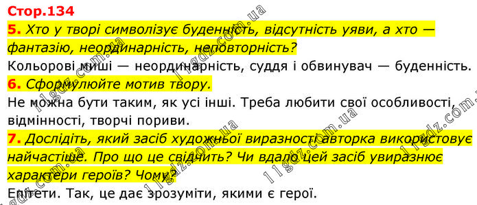 5. Хто у творі символізує буденність, відсутність уяви, а хто — фантазію, неординарність, неповторність? Кольорові миші — неординарність, суддя і обвинувач — буденність. 6. Сформулюйте мотив твору. Не можна бути таким, як усі інші. Треба любити свої особливості, відмінності, творчі пориви. 7. Дослідіть, який засіб художньої виразності авторка використовує найчастіше. Про що це свідчить? Чи вдало цей засіб увиразнює характери героїв? Чому? Епітети. Так, це дає зрозуміти, якими є герої.