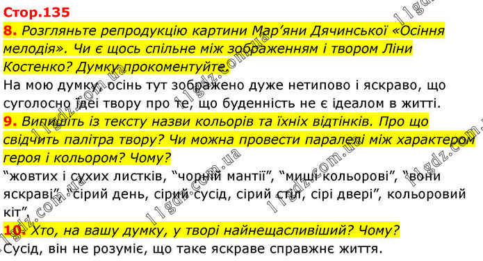8. Розгляньте репродукцію картини Мар’яни Дячинської «Осіння мелодія». Чи є щось спільне між зображенням і твором Ліни Костенко? Думку прокоментуйте. На мою думку, осінь тут зображено дуже нетипово і яскраво, що суголосно їдеі твору про те, що буденність не є ідеалом в житті. 9. Випишіть із тексту назви кольорів та їхніх відтінків. Про що свідчить палітра твору? Чи можна провести паралелі між характером героя і кольором? Чому? “жовтих і сухих листків, “чорній мантії”, “миші кольорові”, “вони яскраві”, “сірий день, сірий сусід, сірий стіл, сірі двері”, кольоровий кіт”. 10. Хто, на вашу думку, у творі найнещасливіший? Чому? Сусід, він не розуміє, що таке яскраве справжнє життя.